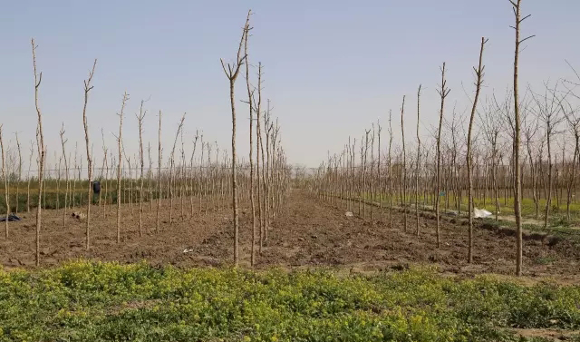 走出東幺苗圃,驅(qū)車駛?cè)敫呱阶用缙裕?800多畝林床,廣袤無垠,苗木高低錯落有致,黃、綠、紅相間,似有橫看成嶺側(cè)成峰之勢。一車車五角楓大樹被運入高山子苗圃等待栽植,一車車紅葉李樹苗被運出高山子苗圃。春季是植樹的主要季節(jié),也是確保公司完成全年造林綠化任務(wù)的關(guān)鍵時期。苗圃里,所有人都是忙碌的,修正林床、平整土地、挖坑、栽樹、澆水一條龍負(fù)全責(zé)。五角楓的栽植有很多技術(shù)要求,老技術(shù)員就手把手帶領(lǐng)年輕員工怎么做樹坑、測量吃水深度、放苗、填土、壓實,關(guān)鍵環(huán)節(jié)還親自動手操作,對吃水不一致的要求重新返工,直到達標(biāo)才算完成一棵樹的栽種。